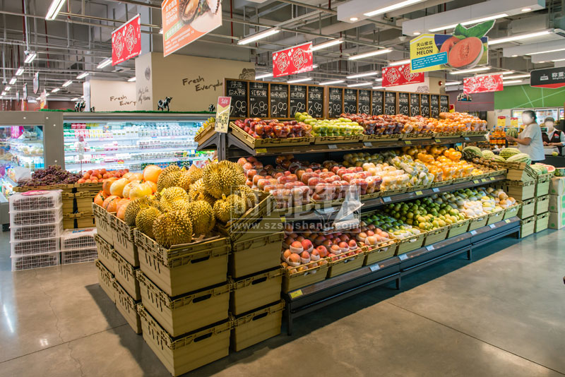 果蔬生鮮一直是超市的重點銷售區域,“樂購express”果蔬區采用了專用的果蔬中島貨架,采用斜角度層板,層板式放置不同高度的木框,每個木框可陳列不同的果蔬產品,并在中島架旁邊放置大型果蔬陳列架,整體陳列效果令人滿意!