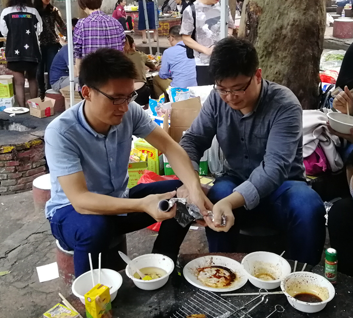 男同事負責烤,女同事負責吃,分工十分完美