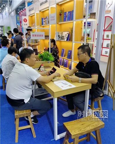 剛過10點,展會就熱鬧了起來,【2B004展位】上展出的書架正是時尚貨架,精美的書架吸引了許多參展觀眾的目光,在眾多書籍和文具展品中脫穎而出。