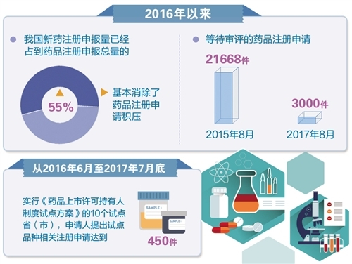 2016年以來,我國新藥注冊(cè)申報(bào)量已經(jīng)占到藥品注冊(cè)申報(bào)總量的55%,基本消除了藥品注冊(cè)申請(qǐng)積壓,等待審評(píng)的藥品注冊(cè)申請(qǐng)已由2015年8月份的21668件降至2017年8月份的3000件。抗生素和疫苗臨床試驗(yàn)申請(qǐng)、中藥民族藥注冊(cè)申請(qǐng)也已實(shí)現(xiàn)按時(shí)限審評(píng)。