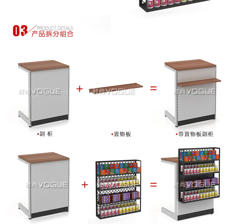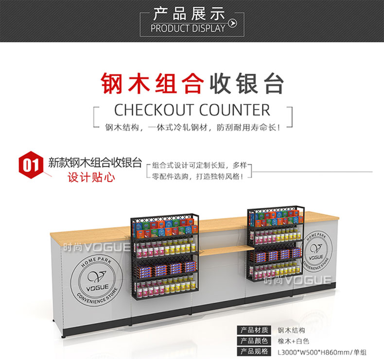 【特點】組合形式,滿足不同收銀區(qū)需求;精選材質(zhì)使用壽命長;擴展側(cè)面空間增強收銀臺功能