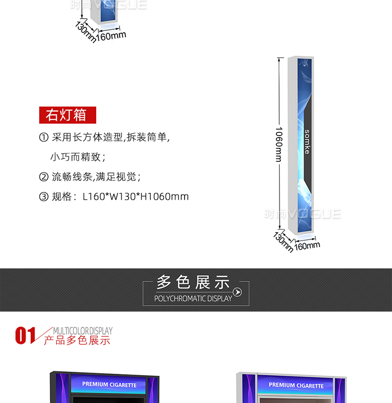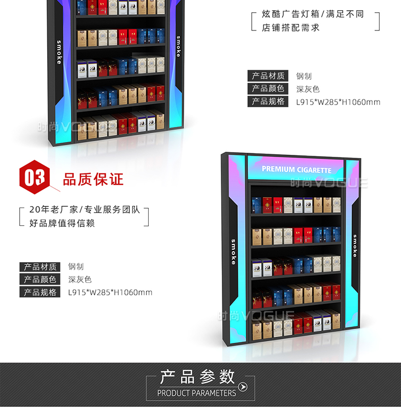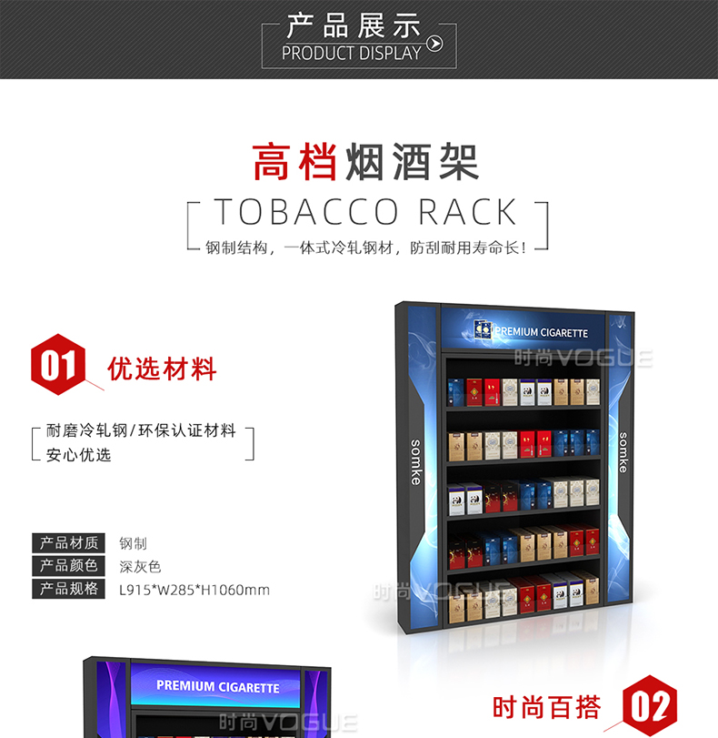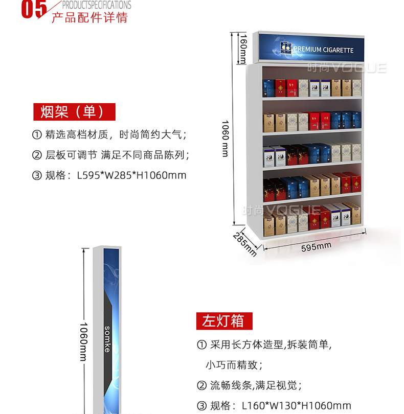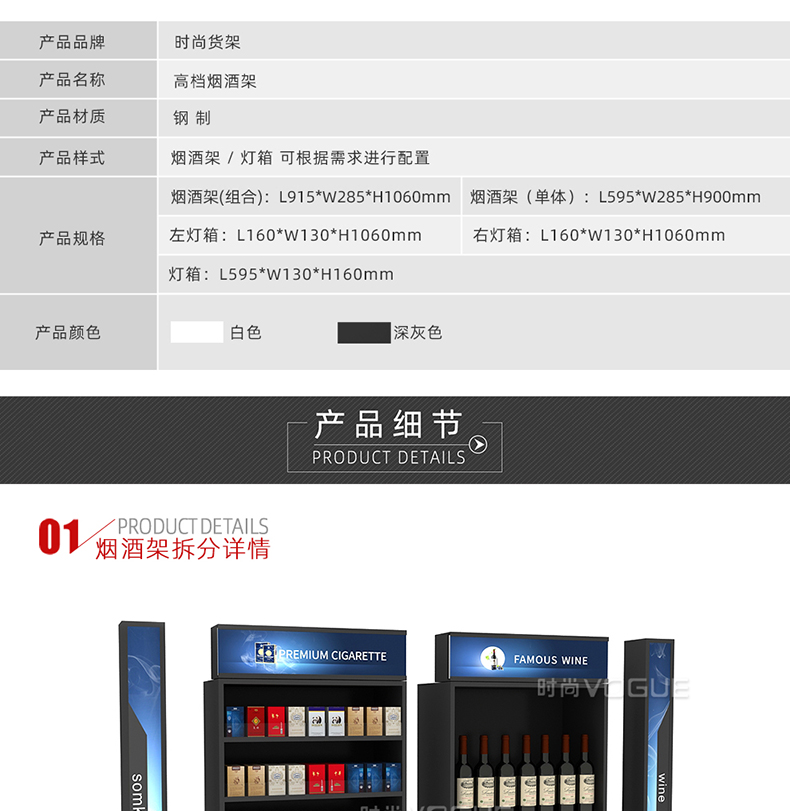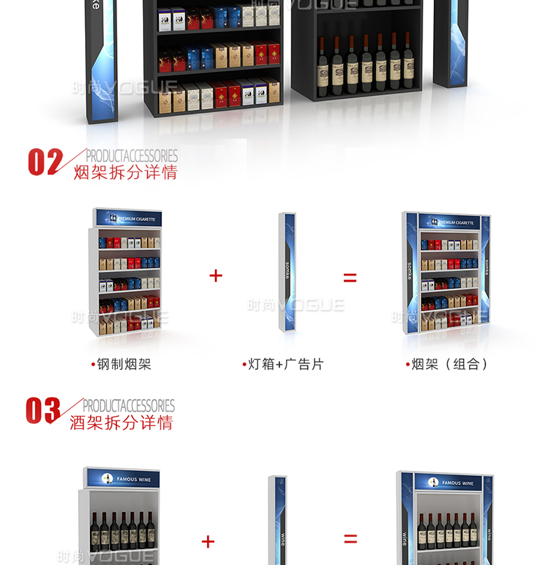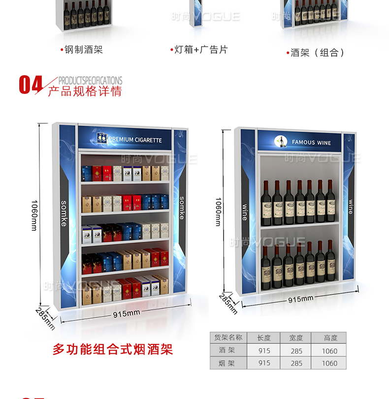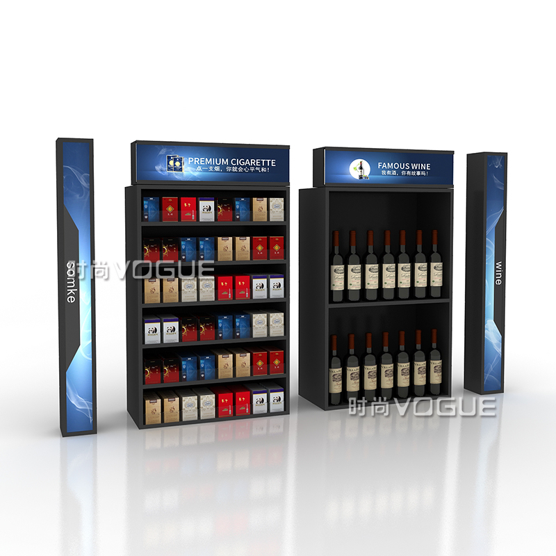 【描述】此款便利店貨架是時尚貨架為便利店收銀區設計的而一款收銀臺煙酒架。它由便利店煙架、便利店白酒架、收銀臺紅酒架組合而成。便利店煙酒架立柱采用優質鋼材,具有很好的承重能力。頂部配有磁吸燈箱廣告牌,即可宣傳品牌,又可以指引顧客,讓整個收銀區的工作效率顯著提高。此款收銀區煙酒架是框架式結構,可以直接放置在收銀背柜上,穩定性和安全性很好。