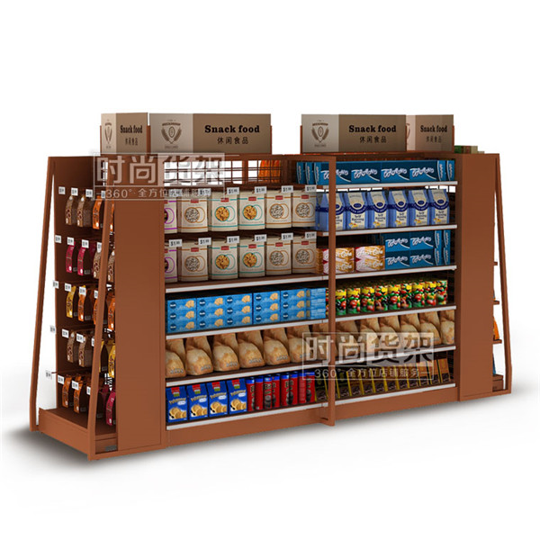 【描述】此款超市貨架是雙面式結構的超市零食貨架,整體由主端頭架、主架、付架組合而成,在端頭架的位置配置了方通掛鉤,適宜袋裝商品懸掛陳列,滿足多種陳列需求。