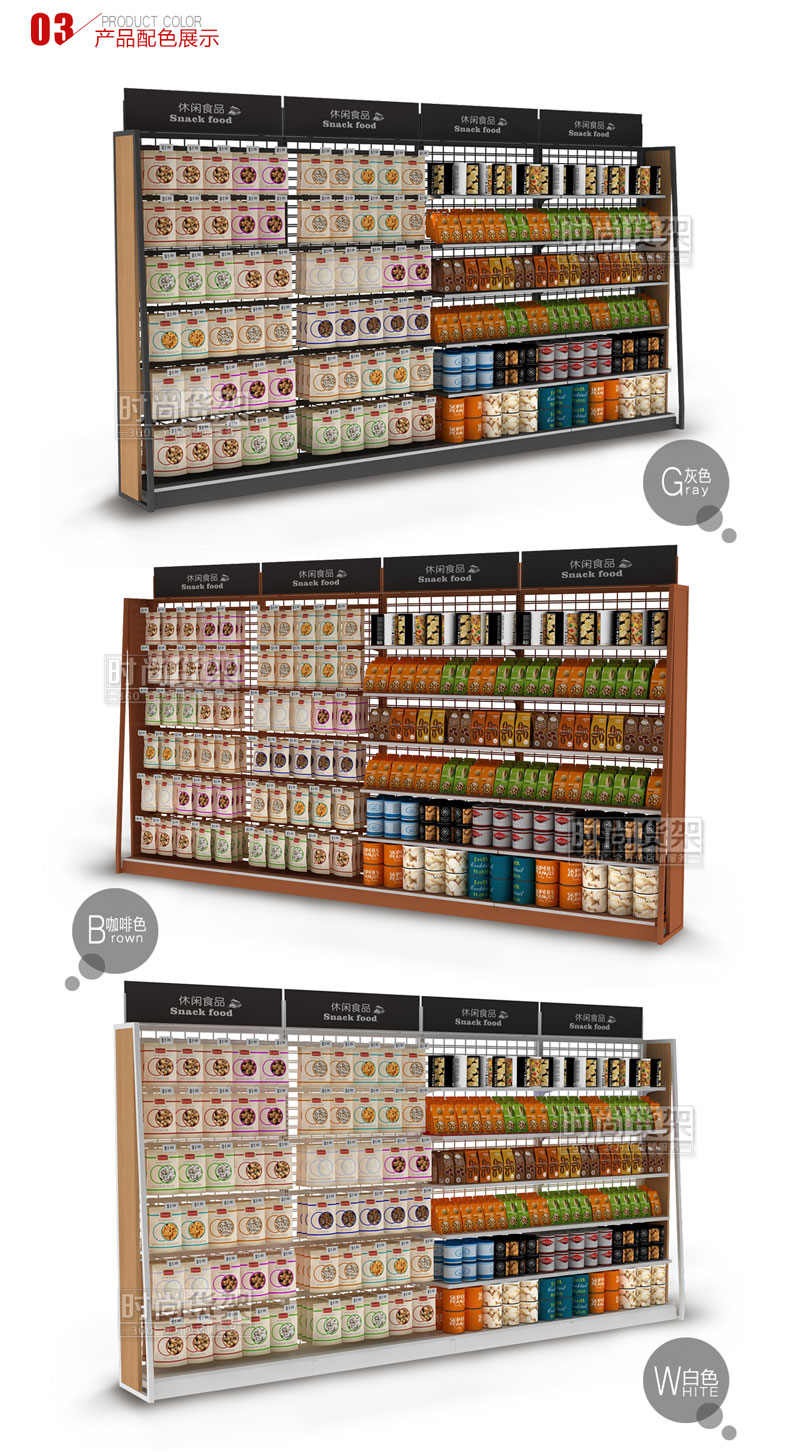 【特點】單面零食貨架1.8米的高度設(shè)計既能很好地利用店鋪空間,又不會因為太高而阻擋顧客看最上層商品的視線。層板和掛鉤相結(jié)合的配置適宜袋裝商品懸掛式陳列,滿足多種陳列需求,一架多用更劃算。