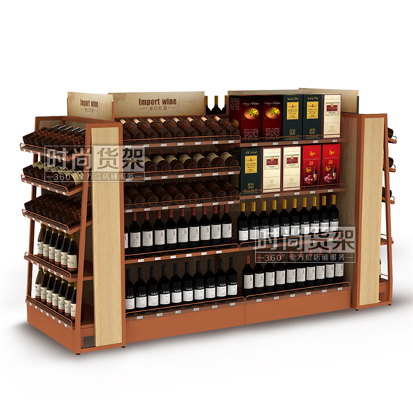 【描述】超市紅酒貨架整體框架為優質冷軋鋼材精制而成,再搭配上環保木側板及背板,彰顯高貴氣質。傾斜式可調節層板的設計更利于紅酒商品的陳列,同時也能從一定程度上避免商品滑落損壞。