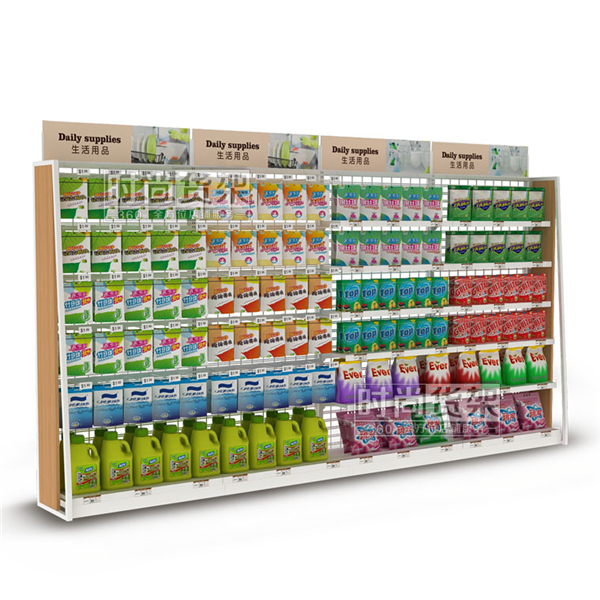 【特點】網背板的設計讓這款超市生活用品貨架更通透,增強了商品的陳列展示效果,增加顧客對店鋪的好感度。頂端的廣告牌設計能對商品進行分類,指引顧客更快速地找到所需的商品。