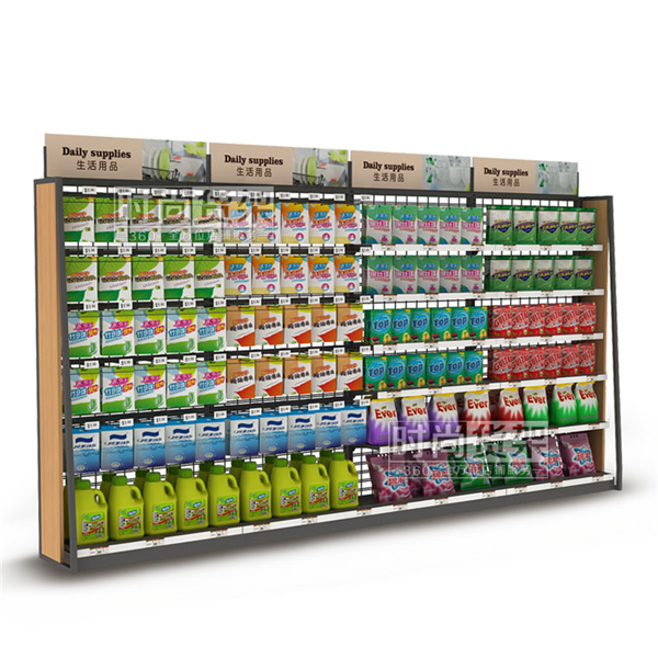 超市生活用品貨架是一款適用于超市生活用品區的單面靠墻貨架,想要了其他超市貨架,請咨詢時尚貨架客服。